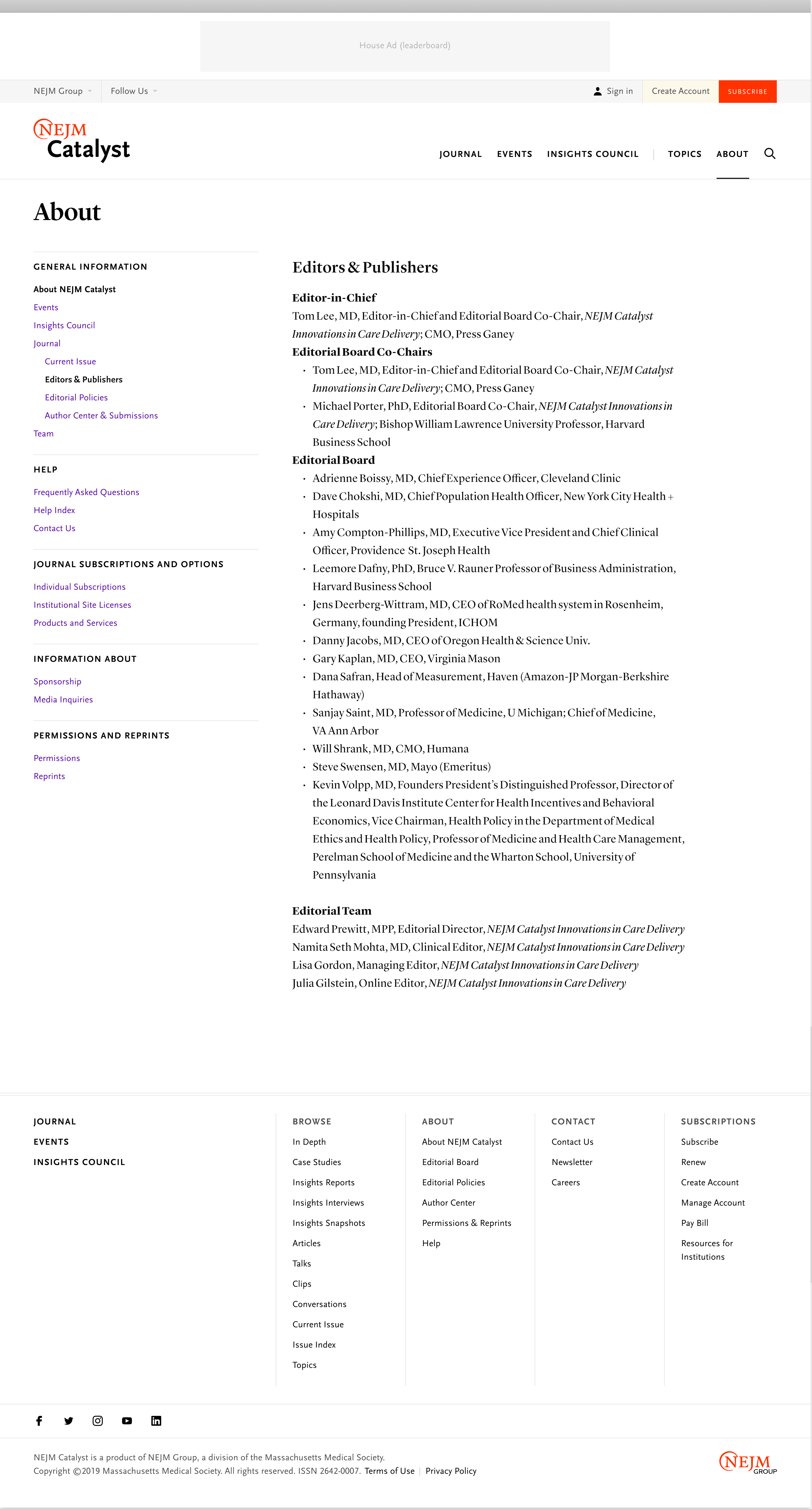 Tom Lee医師と、Michael Porter博士が共同編集長となり、医療業界と学術界からなる幅広い編集陣によって査読されます。