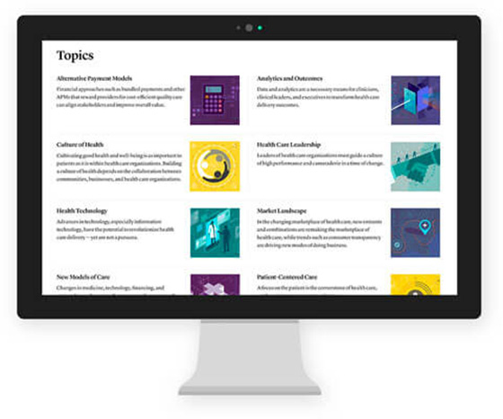 「Leadership」「Data analytics and outcomes」「Health technology」「Patient-centered care」などのトピックを取り上げ、「In-depth articles」「Case studies」「Research reports」などの論文が掲載されます。